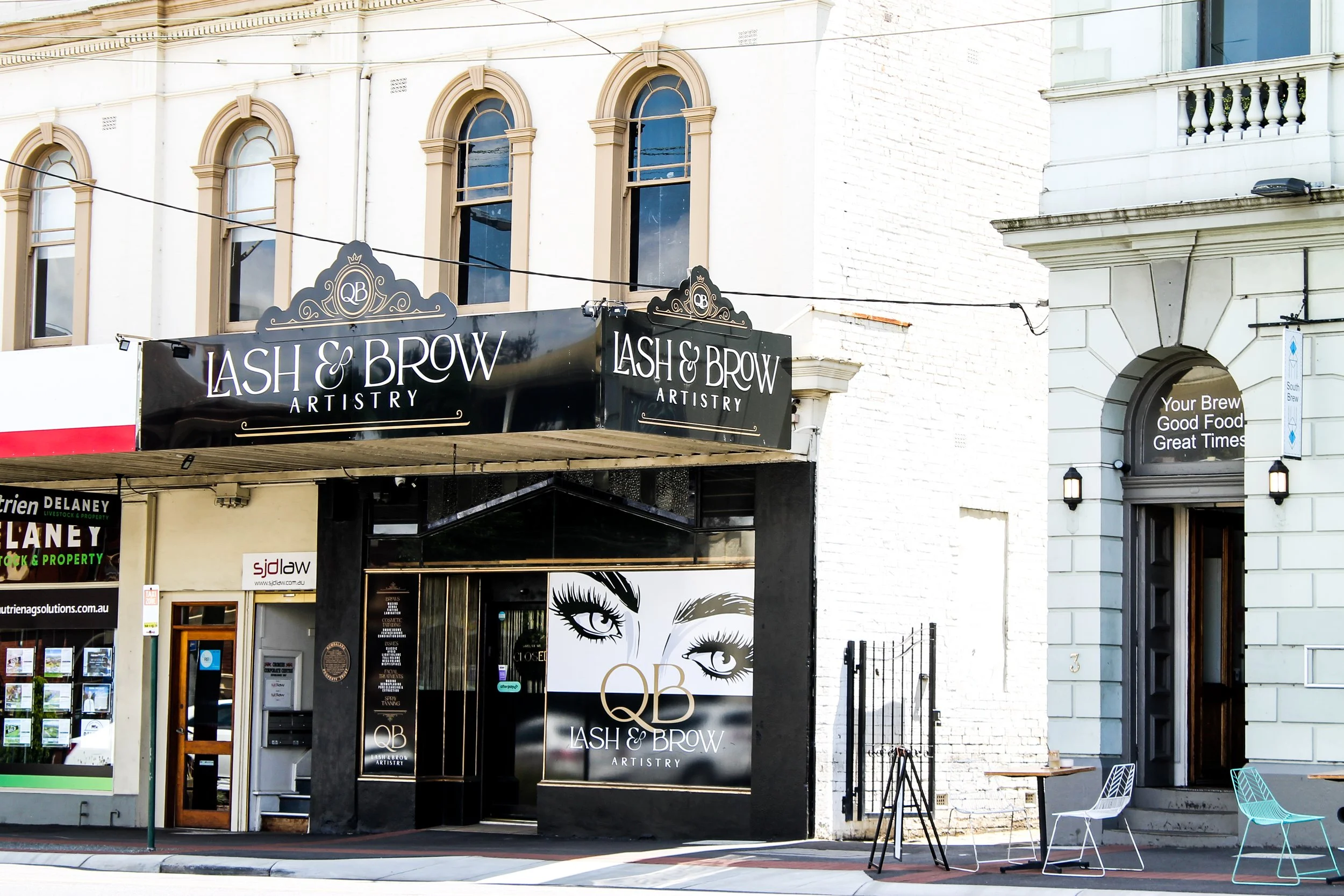 storefront with signs for Lash & Brow Artistry, featuring an eye illustration on the window, exterior brick buildings, outdoor chairs, and a sidewalk.