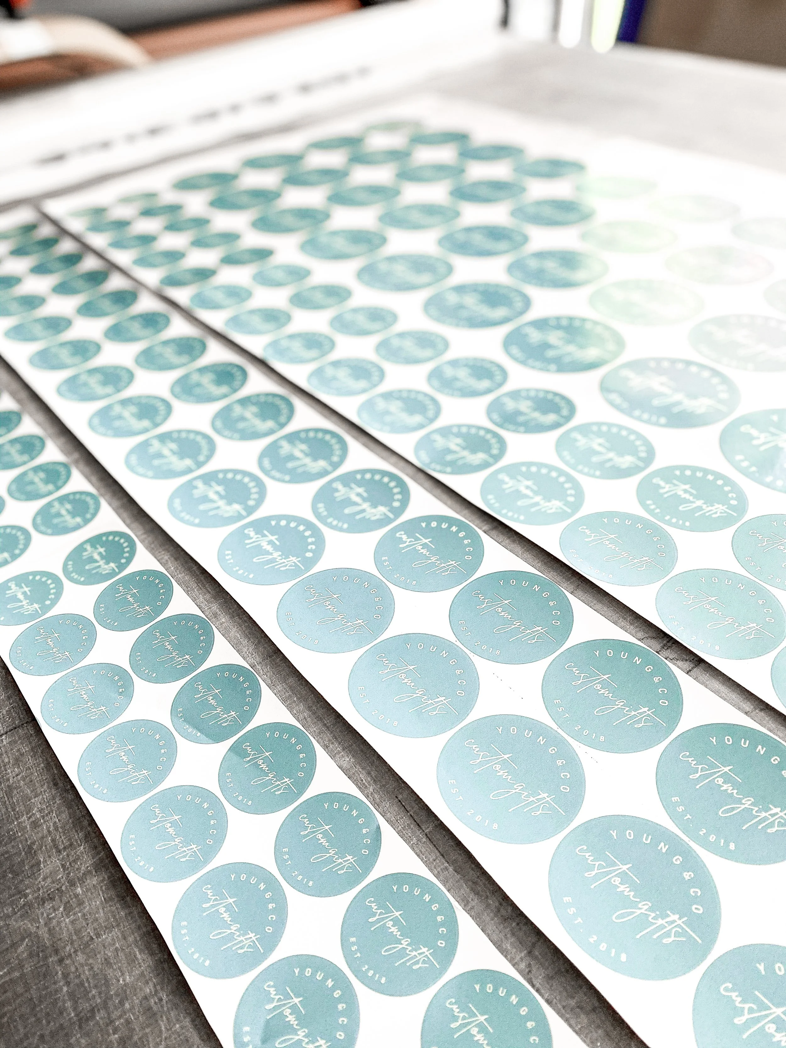 Multiple sheets of round blue stickers on a table, each with white text that reads 'YOUNG&CO expertly' and 'EST. 2018'.