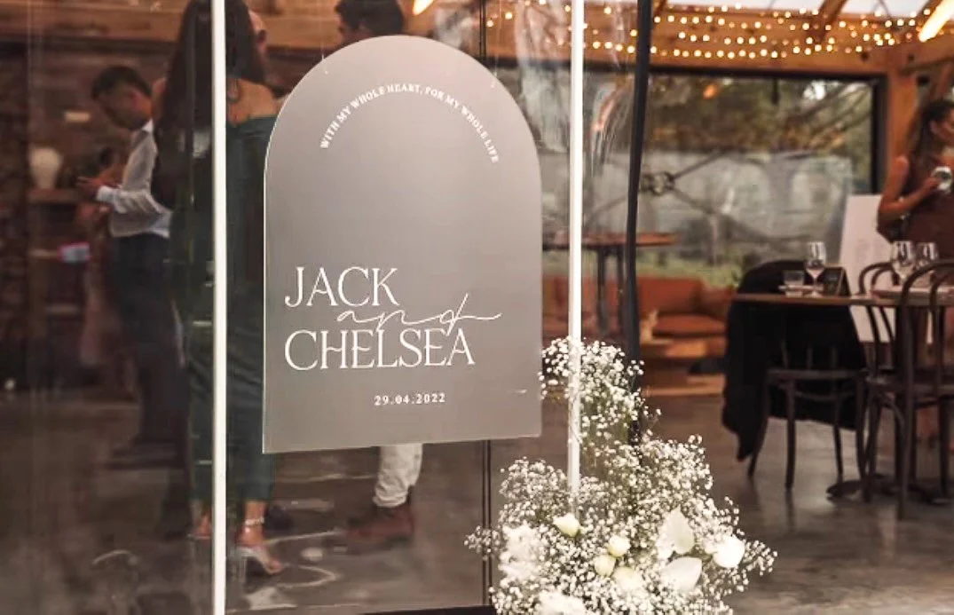 Wedding celebration signs with pastel green background's text 'Celebrating the engagement of Jade and Corey, 07.05.2022' displayed on two separate boards.