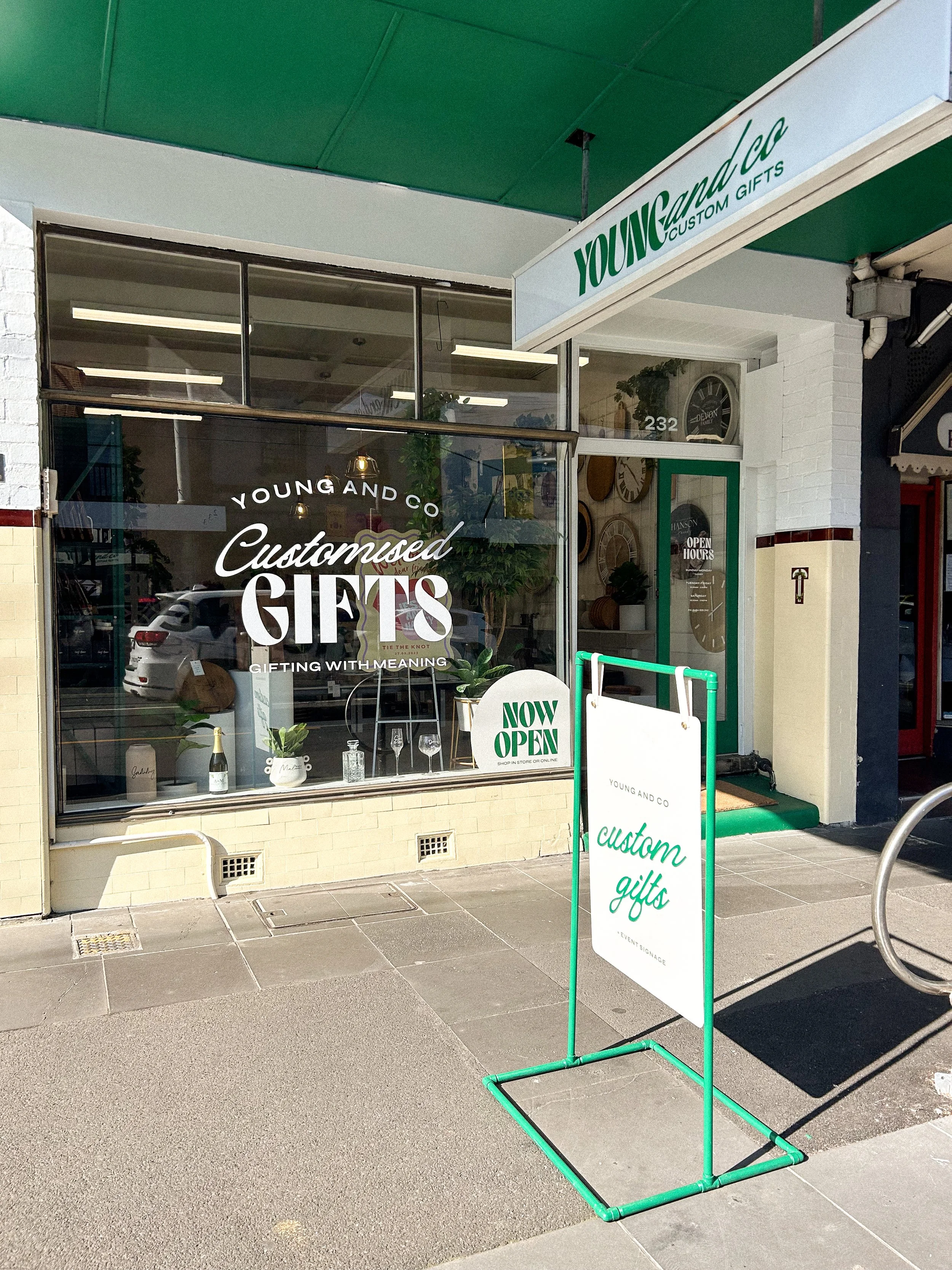 storefront with signage reading 'Young and Co Custom Gifts' and a sandwich board sign that says 'Now Open' and 'custom gifts' outside on the sidewalk.