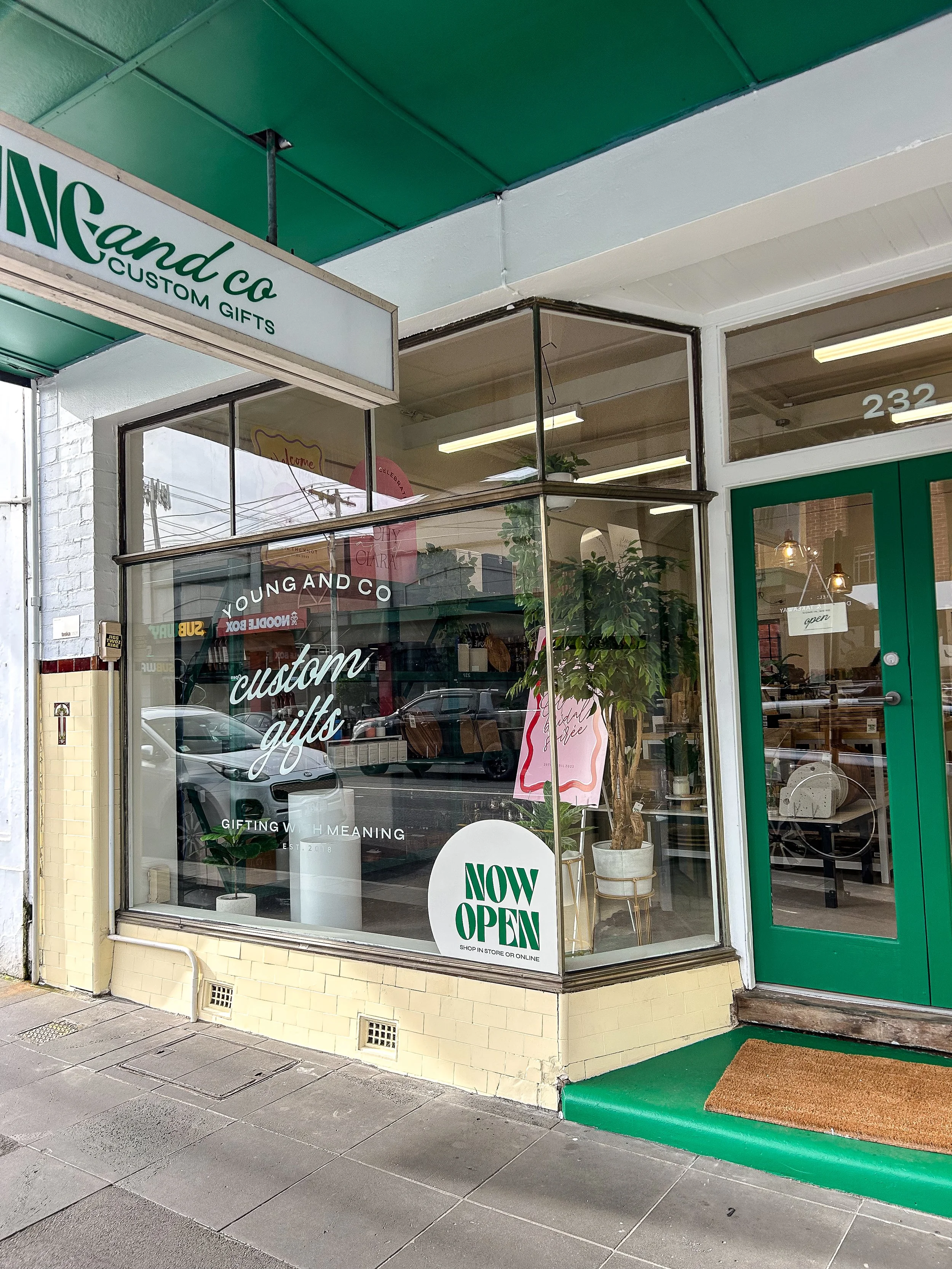Exterior of a gift shop named Young and Co Custom Gifts, with a large front window display of various items, a green door, and signs indicating the shop is open.