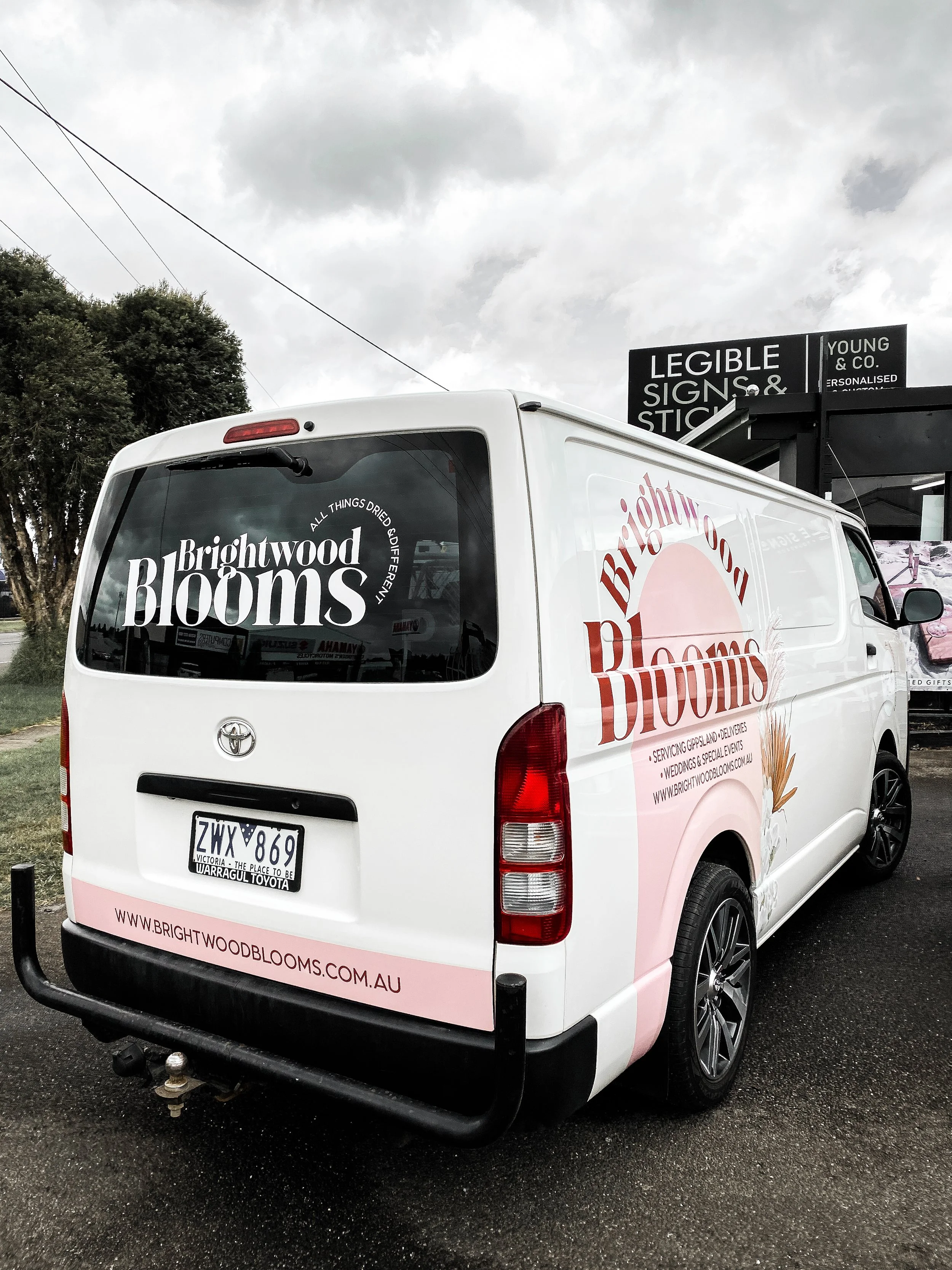 White delivery van with floral and leaf graphics, advertising Brightwood Blooms floral service, with website URL.