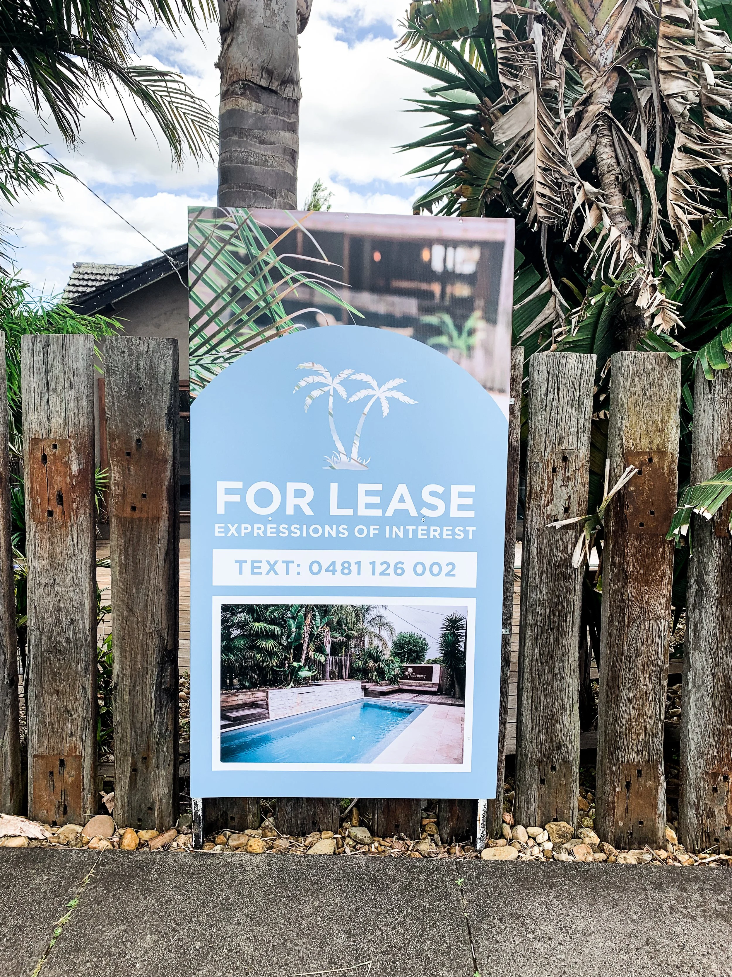 A blue and white sign for lease, featuring a picture of a swimming pool and tropical greenery behind a wooden fence, with palm trees and a cloudy sky in the background.